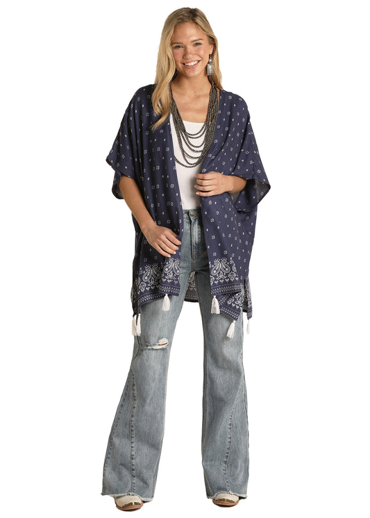 Panhandle Slim® Women's Navy Bandana Border Print Tasseled Kimono