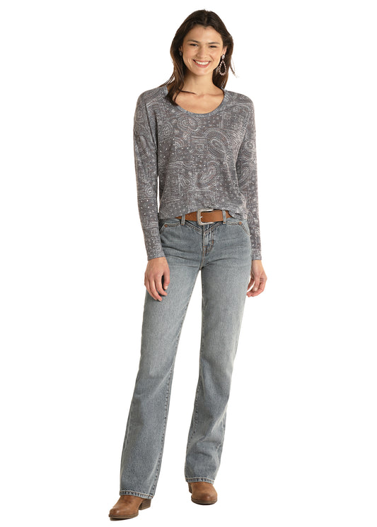 Panhandle Slim® Women's Light Navy Bandana Print Long Sleeve Sweater