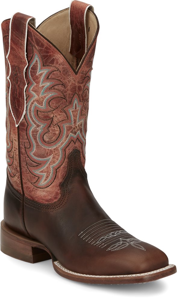 These Justin® Women's Brown Dusty Western Square Toe Cowboy Boots bring timeless style and quality craftsmanship in a unique combination. The classic, square-toe silhouette with block heel is crafted from brown cowhide leather, and finished with a durable leather outsole. These unique boots have 11” tops for added style.